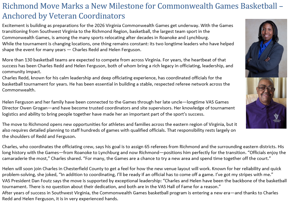 Happy New Year! 2026 is here and off to a great start. This year will offer many new beginnings as the Virginia Commonwealth Games head for the capital city of Richmond. Planning is starting to come together, and the excitement continues to grow. While the Games will be in Richmond, we will also be celebrating America250, our country’s 250th year. Stay tuned to our website as we build on what will be the best Games ever.